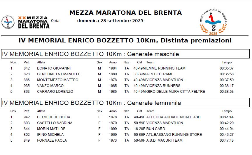 Nella 10 chilometri – Memorial Enrico Bozzetto, valida anche per il titolo italiano AICS, Giovanni Bonato ha conquistato il successo in 35:37, mentre Sofia Belvedere ha dominato la prova femminile in 41:44, diventando la nuova regina della 10K rosa.